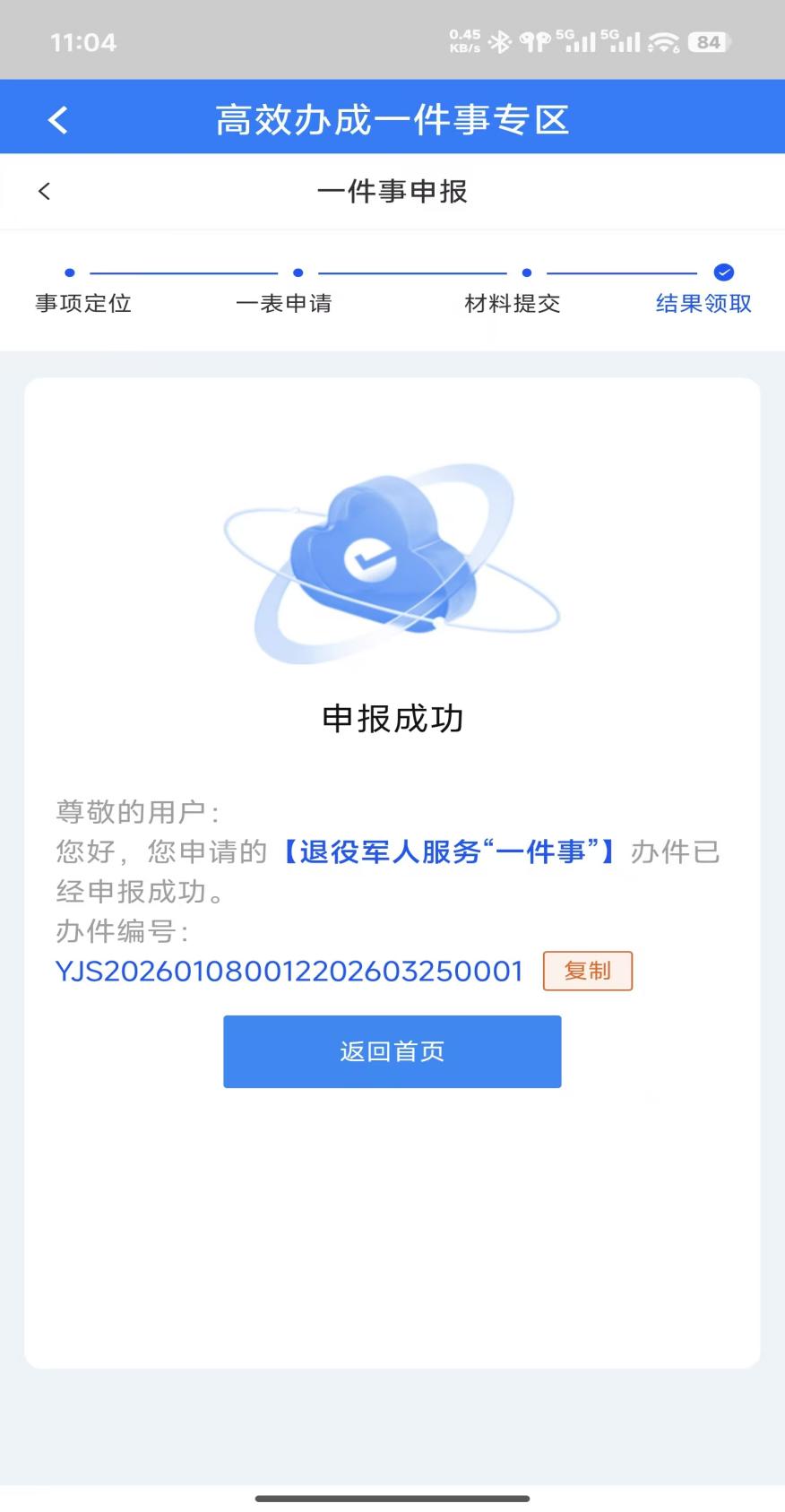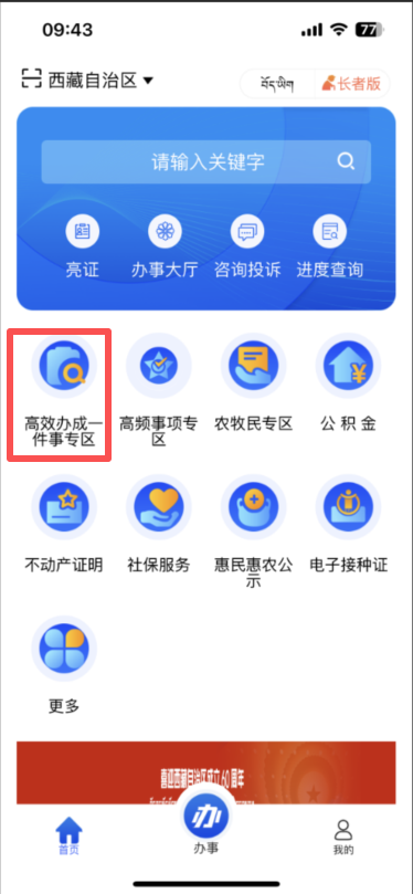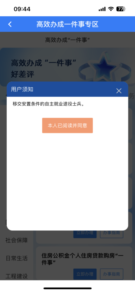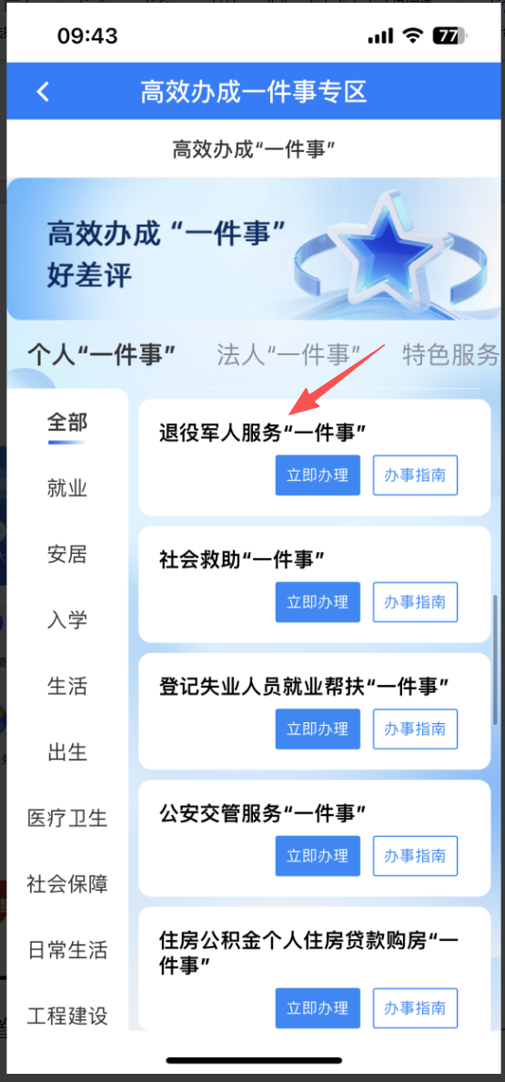 1.登录完成后,点击首页,进入高效办成一件事专区,找到退役军人服务“一件事”,点击立即办理。