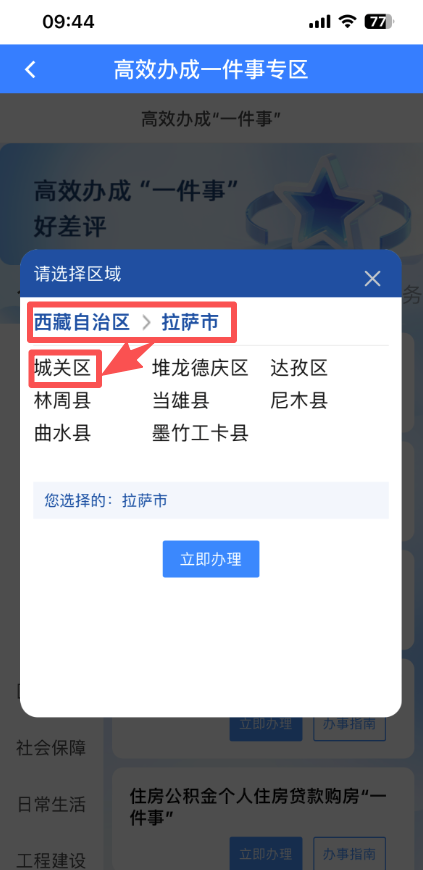 2.选择您要进行退役报到的安置地,务必精准选至最末级区县,如拉萨市——城关区。点击“本人阅读并同意”。