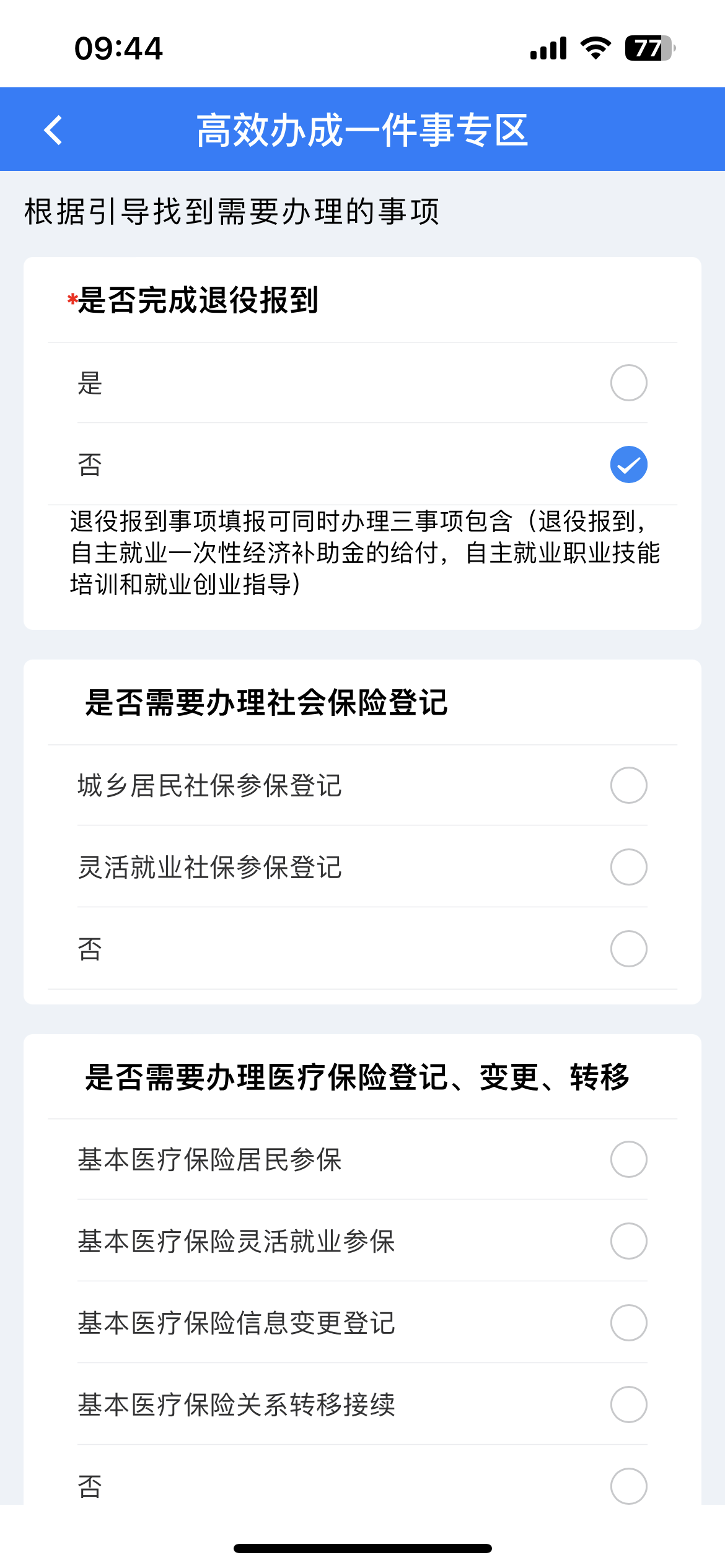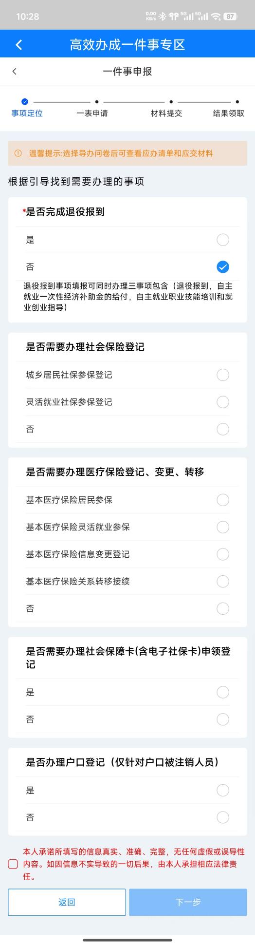 3.“是否完成退役报到”选项,选择“否”,查看所有可办事项,按需勾选人社部门、医保部门、公安部门的办理事项,勾选“本人承诺”,点击下一步。