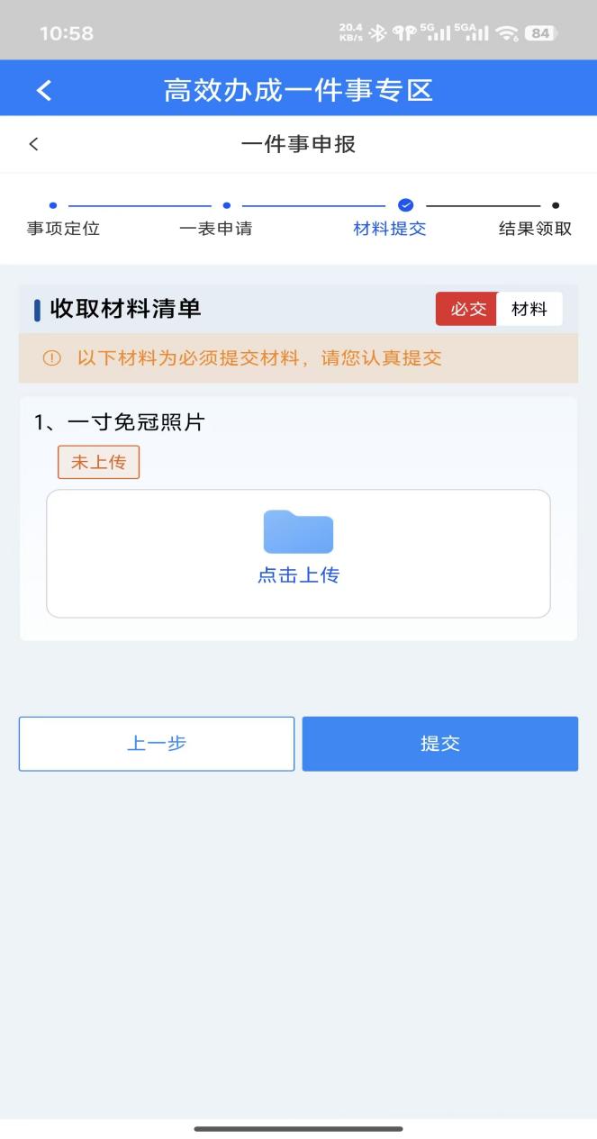 6.上传事项所需电子材料,确认无误后,点击提交。